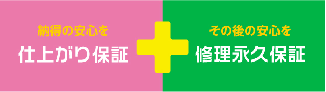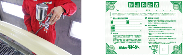仕上がり保証とは、完成後の出庫前にお客様立会いで仕上がりをチェックしていただき、万一ご納得いただけない場合は、何度でもやり直しさせて頂く保証です。そして修理永久保証とは、当社で板金修理した箇所に不具合が発生した場合は、お客様がそのお車に乗り続けている限り何度でもやり直しさせて頂く保証です。